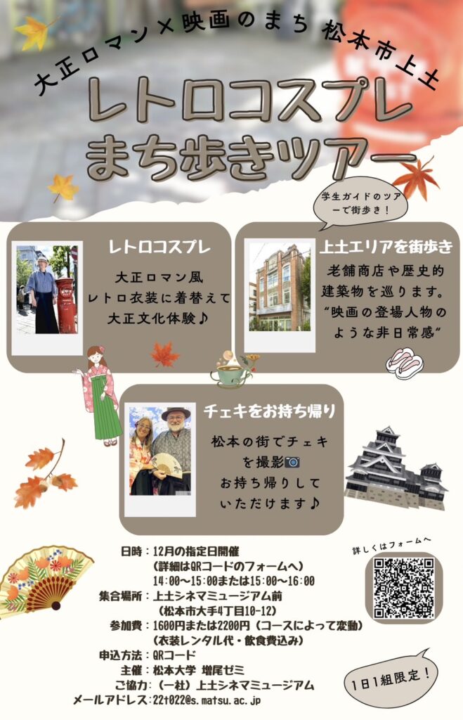松本大学 観光ホスピタリティ学科の増尾ゼミに所属する4年生3人が、大正ロマンを感じさせるレトロコスプレをして松本市の上土(あげつち)通りを散策する「レトロコスプレまち歩きツアー」企画を始めました。
